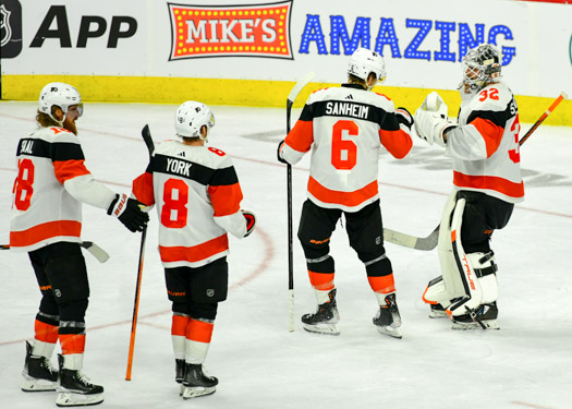 Teammates line up to congratulate goalie Felix Sandstrom #32 of the Philadelphia Flyers for his win against the Ottawa Senators.