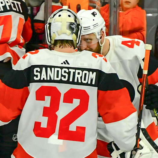 Philadelphia Flyers Nick Deslauriers #44 give a congratulatory head-but to his teammate Felix Sandstrom #32 for his performance in net against the Ottawas Senators.