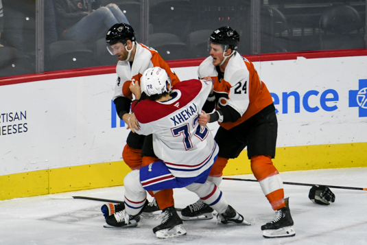 Nick Seeler #24 of the Philadelphia Flyers interrupts Arber Xhekaj #72 of the Montreal Canadiens attempt to fight Flyers Captain Sean Couturier #14