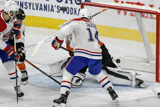 Nick Suzuki #14 of the Montreal Canadiens scores against the Philadelphia Fyers in the first period.