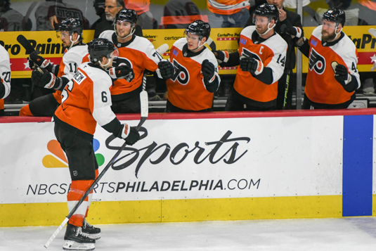 Travis Sanheim #6 of the Philadelphia Flyers receives congratulations from his teammates