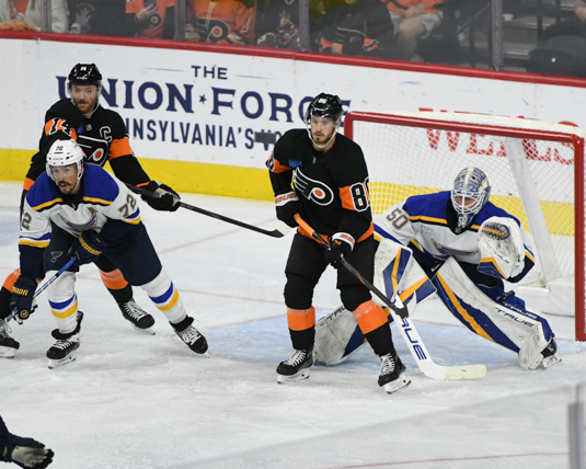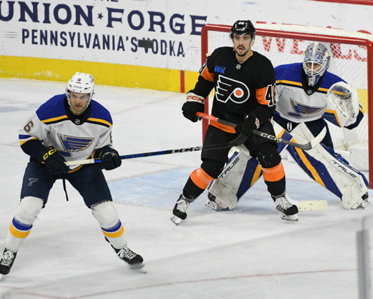 Morgan Frost #48 of the Philadelphia Flyers attempts to screen goalie Jordan Binnington #50 of the St Louis Blues