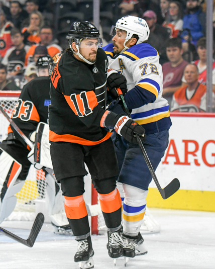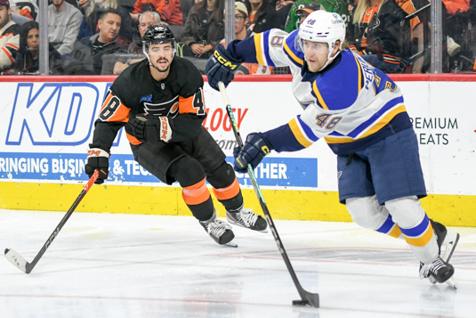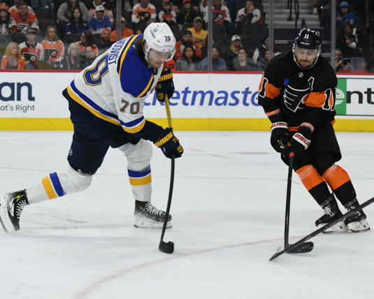 Oskar Sundqvist #70 of the St Louis Blues face-off agains Matvei Michkov #39 of the Philadelphia Flyers