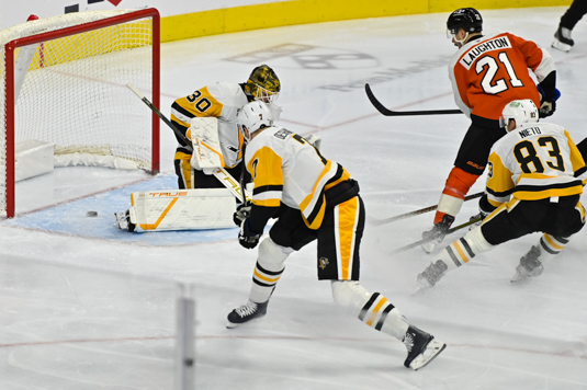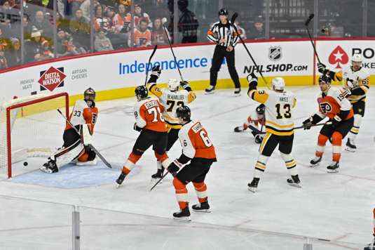 Pittsburgh Penguins goalie Joel Blomqvist #30 failed attempt to clear the puck past Garnet Hathaway #19 of the Philadelphia Flyers results in a goal.