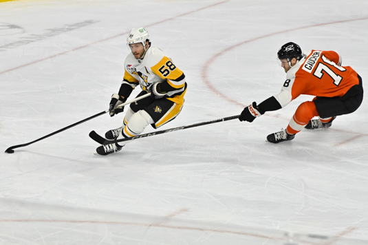 Kris Letang #58 of the Pittsburgh Penguins avoids the sweeping stick check of Jacob Gaucher #78 of the Philadelphia Flyers