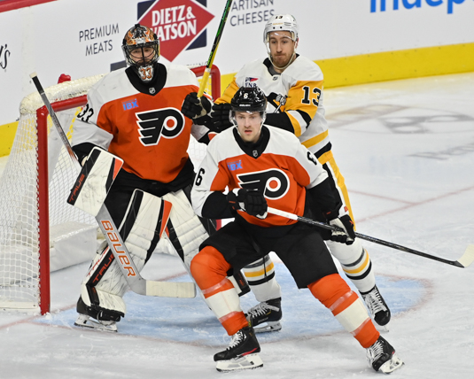 Samuel Ersson #33 and Travis Sanheim #6 of the Philadelphia Flyers attempt to keep Kevin Hayes #13 of the Pittsburgh Penguins out of the crease.