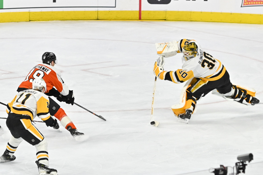 Goalie Samuel Ersson #33 of the Philadelphia Flyers stops a wraparound shot by Anthony Beauvillier #72 of the Pittsburgh Penguins