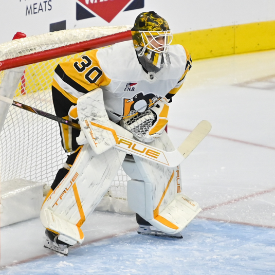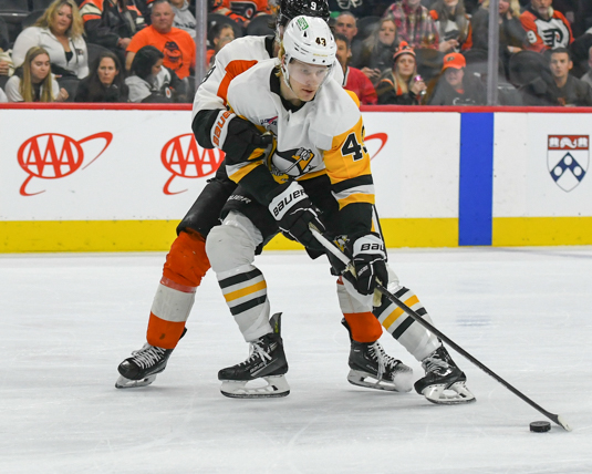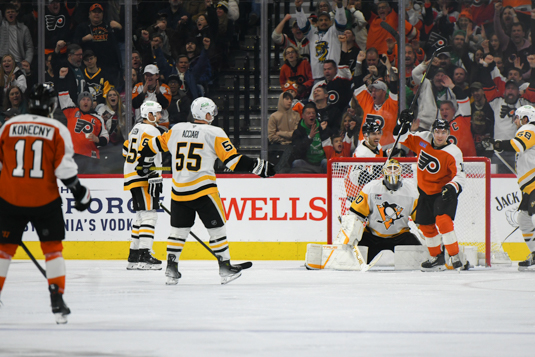 Pittsburgh Penguins goalie Joel Blomqvist #30 failed attempt to clear the puck past Garnet Hathaway #19 of the Philadelphia Flyers results in a goal.
