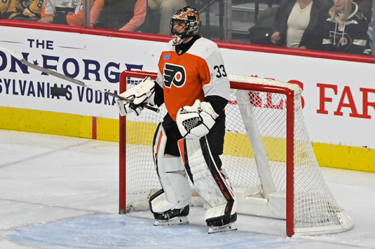 Goalie Samuel Ersson #33 of the Philadelphia Flyers stops a wraparound shot by Anthony Beauvillier #72 of the Pittsburgh Penguins