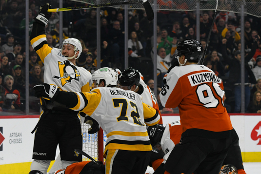Kris Letang #58 of the Pittsburgh Penguins avoids the sweeping stick check of Jacob Gaucher #78 of the Philadelphia Flyers