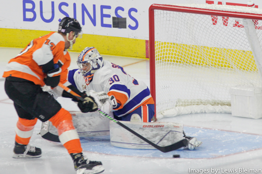 Ilya Sorokin #30 of the New York Islanders makes a pad save against Kevin Hayes #13 of the Philadelphia Flyers