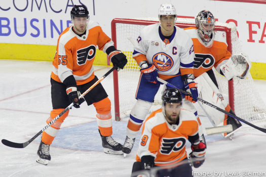 Anders Lee #27 of the New York Islanders attempts to screen Carter Hart #79 of the Philadelphia Flyers. Rasmus Ristolainen #55 and Ivan Provorov #9 of the Philadelphia Flyers