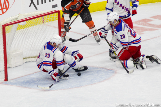 K’Andre Miller #79 and Jacob Trouba #8 of the New York Rangers along with Michael Raffl #12 of the Philadelphia Flyers look for the rebounding puck