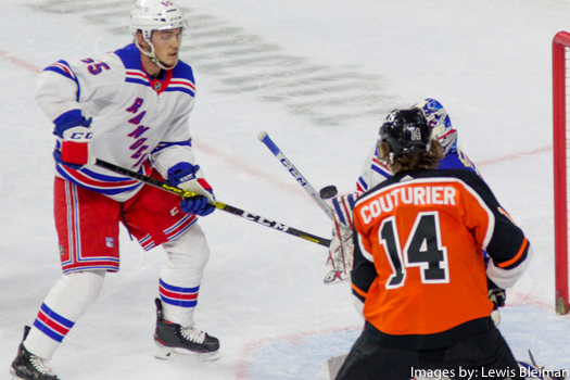 NHL 2021 Mar 27 NYR vs PHI Published March 27, 2021 at 525 × 350 in Flyers get one back form the Rangers Ryan Lindgren #55 of the New York Rangers an Sean Couturier #14 of the Philadelphia Flyers watch the puck deflect off the handle of the goalie stick