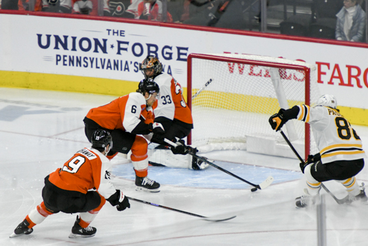 Travis Sanheim #6 of the Philadelphia Flyers redirects a shot by David Pastrnak #88 of the Boston Bruins away from the net.