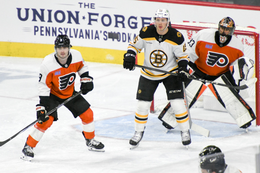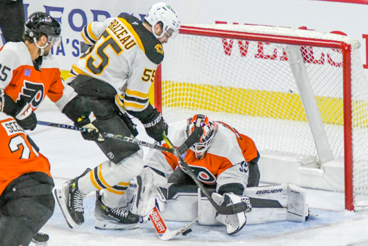 Justin Brazeau #55 of the Boston Bruins looks to deflect a shot past Aleksei Kolosov #35 of the Philadelphia Flyers