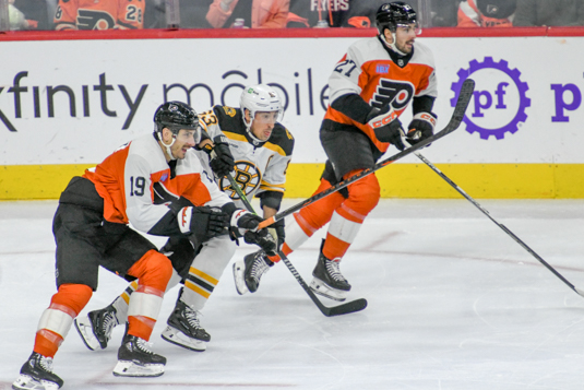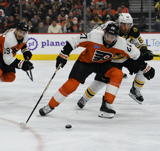 Garnet Hathaway #19 and Noah Cates #27 of the Philadelphia Flyers race Brad Marchand #63 of the Boston Bruins in pursuit of the puck