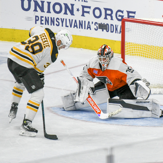 Aleksei Kolosov #35 of the Philadelphia Flyers makes a save against Justin Brazeau #55 of the Boston Bruins