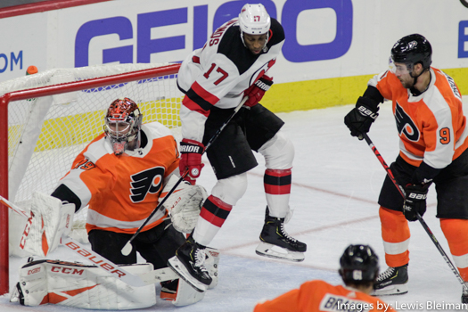 Wayne Simmonds (#17) of the New Jersey Devils jumps to screen Goalie Carter Hart (#79) of the Philadelphia Flyers