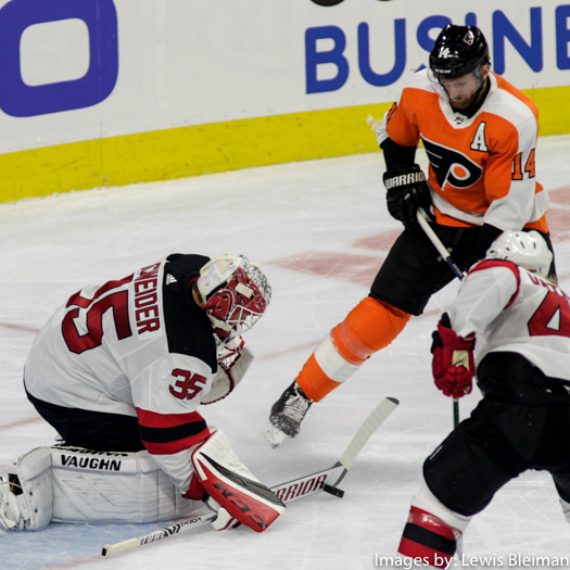 Goalie Cory Schneider (#35) and Andy Greene (#6) of the New Jersey Devils and James van Riemsdyk (#25) of the Philadelphia Flyers.