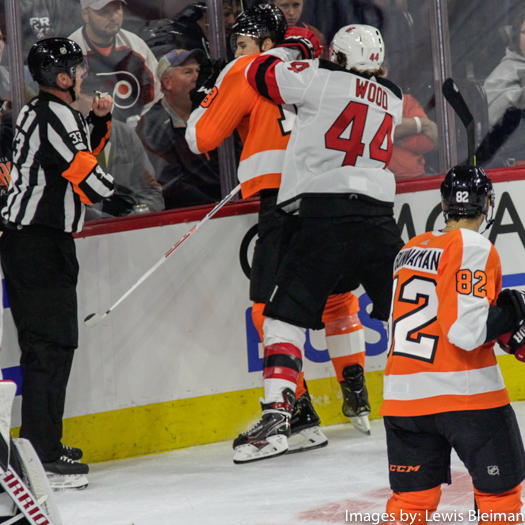 Tyler Pitlick (#18) of the Philadelphia Flyers is on the receiving end of a roughing penalty by Miles Wood (#44) of the New Jersey Devils