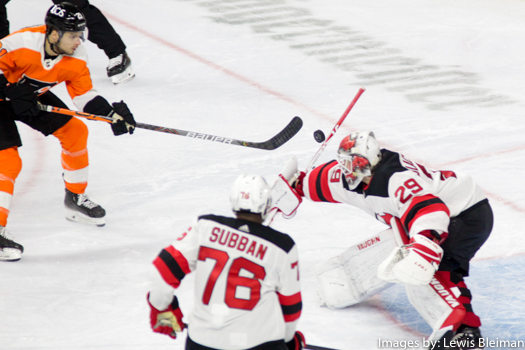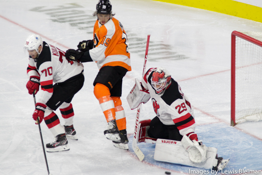 Nolan Patrick #19 of the Philadelphia Flyers attemptes to screen Mackenzie Blackwood #29 of the New Jersey Devils