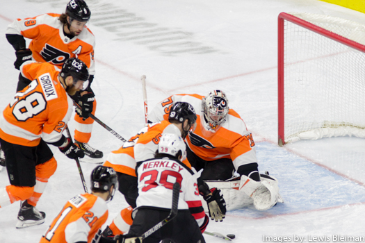 Nicholas Merkley #39 of the New Jersey Devils advances the puck towards the net and is surrounded by Philadelphia Flyers players