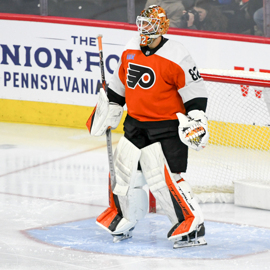 The puck flies over the head of Jakob Pelletier #22 of the Philadelphia Flyers towards Flyers goalie Ivan Fedotov #82