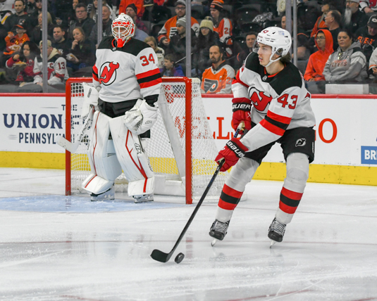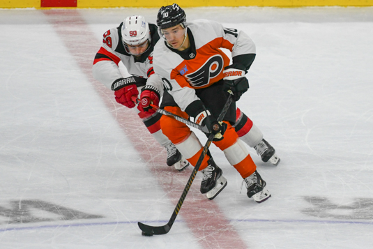 Nico Hischier #13 of the New Jersey Devils attempts to slow down Ryan Poehling #25 of the Philadelphia Flyers