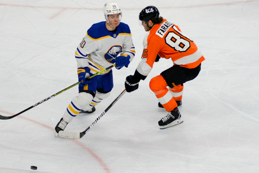DSC_4348 Published March 10, 2021 at 525 × 350 in Flyers need extra time and more to defeat Sabres, 5-4 Philadelphia Flyers #86 Joel Farabee attempts to advance the puck around Bufflao Sabres #10 Henri Jokiharju