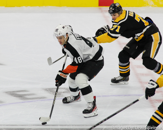 Morgan Frost #48 of the Philadelphia Flyers controls the puck against Evgeni Malkin #71 of the Pittsburgh Penguins chase