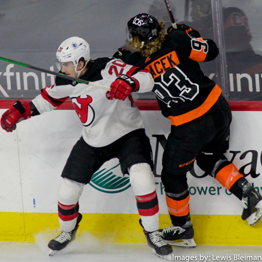 Jakub Voracek #93 of the Philadelphia Flyers moves in as Nico Hischier #13 of the New Jersey Devils take a slap shot
