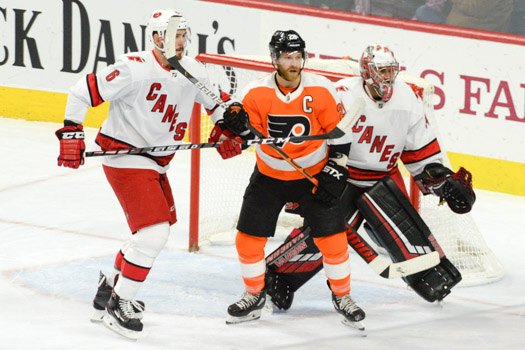Carolina Hurricanes Joel Edmundson (#6) and Goalie Petr Mrazek (#34). Philadelphia Flyers Captain Claude Giroux (#28)