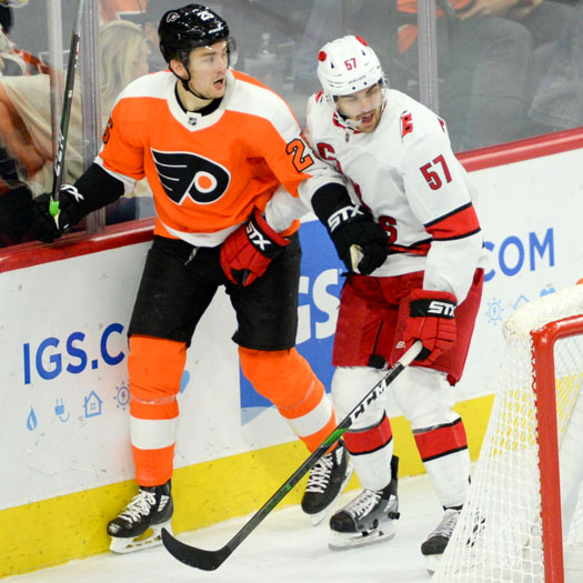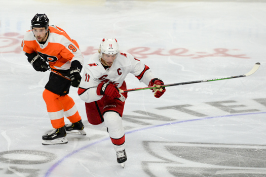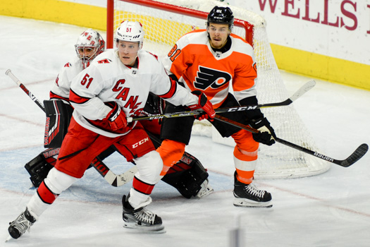 Philadelphia Flyers Defenseman Ivan Provorov (#9) and Carolina Hurricanes Captain Jordan Staal (#11)