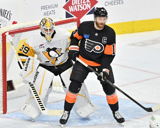 Scott Laughton #21 of the Philadelphia Flyers and Blake Lizotte #46 of the Pittsburgh Penguins prepare for a face-off.