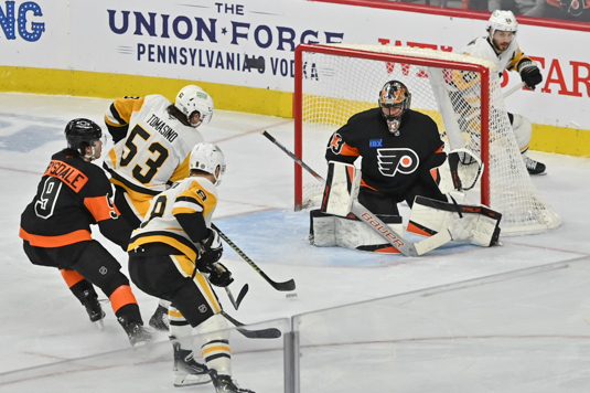 Samuel Ersson #33 of the Philadelphia Flyers prepares to deflect a shot by Vincent Desharnais #7 of the Pittsburgh Penguins