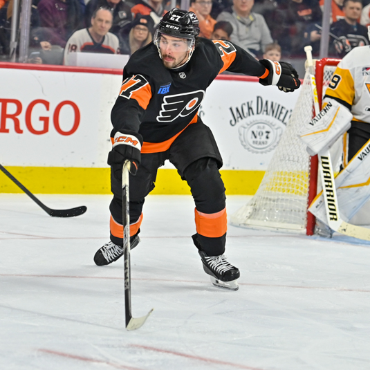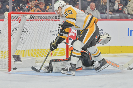 Noah Cates #27 of the Philadelphia Flyers scores against the Pittsburg Penguins in the first period.