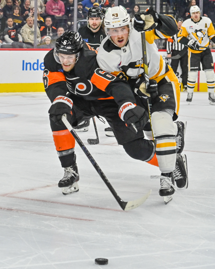 Travis Sanheim #6 of the Philadelphia Flyers and Philip Tomasino #53 of the Pittsburgh Penguins battle for the loose puck.