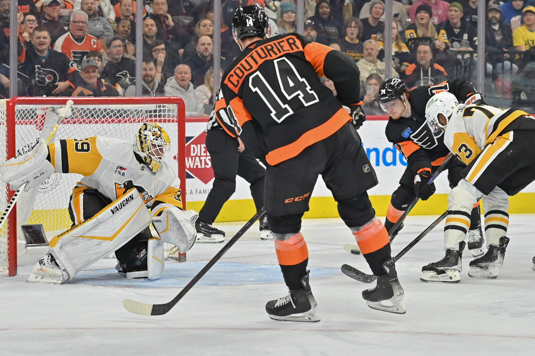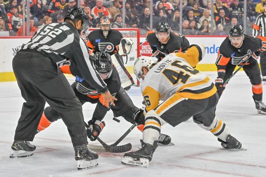 PHILADELPHIA – The Flyers’ Bobby Brink collected four points on Tuesday night off a goal and three assists in a 6-1 win for Philadelphia over the visiting Pittsburgh Penguins.