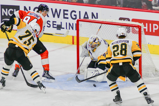 NHL 2026_04_ 22 Philadelphia Flyers vs Pittsburgh Penguins Published April 23, 2026 at 535 × 357 in Flyers rout Penguins for 3-0 series lead Stuart Skinner #74 of the Pittsburgh Penguins reaches to cover the puck before Porter Matone #94 of the Philadelphia Flyers gathers a rebound