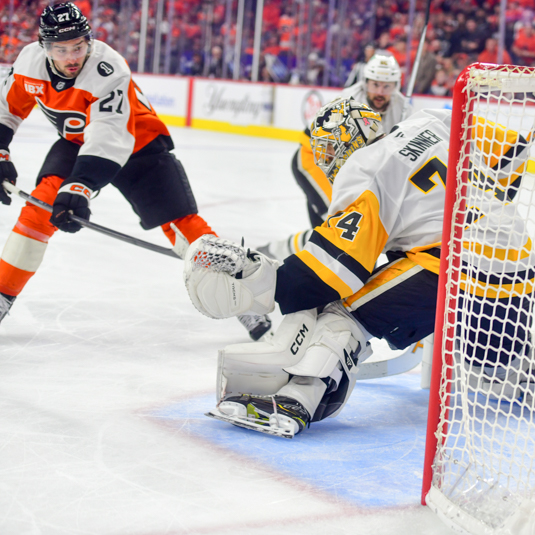 NHL 2026_04_ 22 Philadelphia Flyers vs Pittsburgh Penguins Published April 23, 2026 at 535 × 535 in Flyers rout Penguins for 3-0 series lead Stuart Skinner #74 of the Pittsburgh Penguins uses his glove to stop a shot by Noah Cates #27 of the Philadelphia Flyers