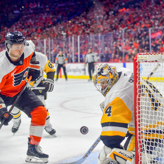 NHL 2026_04_ 22 Philadelphia Flyers vs Pittsburgh Penguins Published April 23, 2026 at 535 × 535 in Flyers rout Penguins for 3-0 series lead Tyson Foerster #71 of the Philadelphia Flyers and Stuart Skinner #74 of the Pittsburgh Penguins