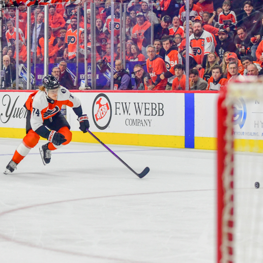 NHL 2026_04_ 22 Philadelphia Flyers vs Pittsburgh Penguins Published April 23, 2026 at 535 × 535 in Flyers rout Penguins for 3-0 series lead Owen Tippett #74 of the Philadelphia Flyers chases down the puck and score against the empty net.