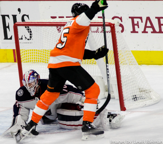 James van Riemsdyk #25 of the Philadelphia Flyers scores against Joonas Korpisalo #70 of the Columbus Blue Jackets