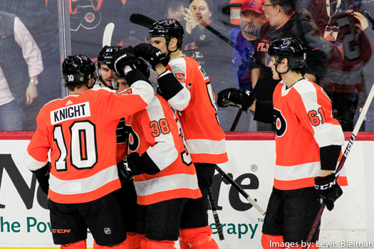 Philadelphia Flyers teammates congratulates Right Wing Ryan Hartman (#38) of the Philadelphia Flyers for his goal in the third period.