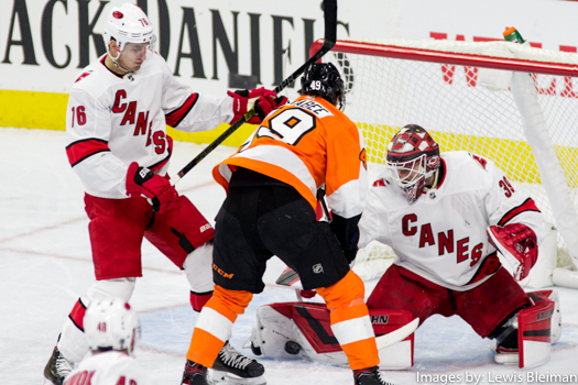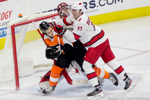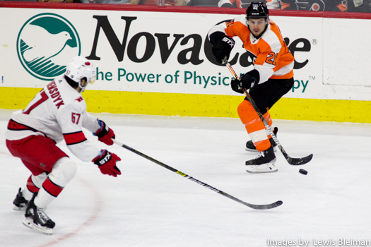 Scott Laughton #21 of the Philadelphia Flyers passes the puck over the stick of Trevor van Riemsdyk #57 of the Carolina Hurricanes
