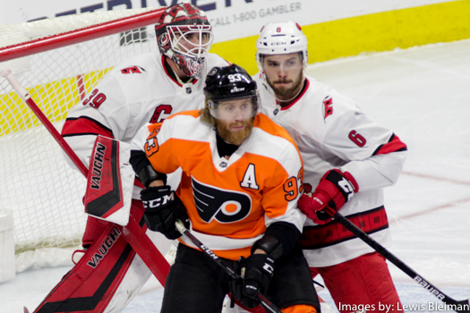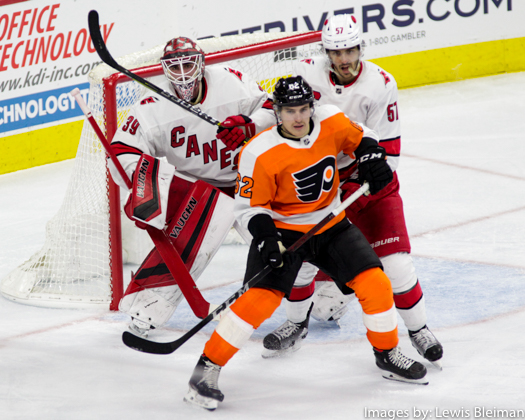 Nicolas Aube-Kubel #62 of the Philadelphia Flyers set the screen on Carolina Hurricanes Goalie Alex Nedeljkovic #39 as Trevor van Riemsdyk #57 of the Carolina Hurricanes moves in to help his goalie.