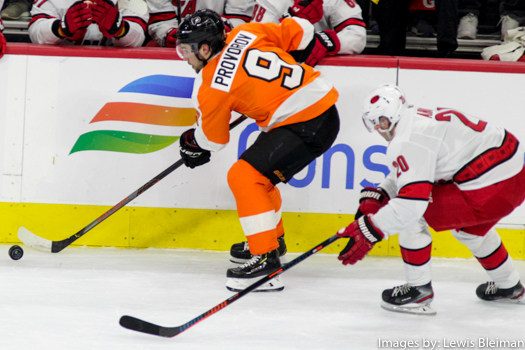 Ivan Provorov #9 of the Philadelphia Flyers controls the puck against Sebastian Aho #20 of the Carolina Hurricanes
