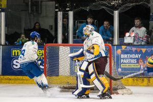 In the 22nd minute the Flyers almost levelled when Robson juggled a puck put on net and with Lucas Chiodo lurking he finally managed to cover the puck up and get the stoppage. Jack Hopkins went short side on Voris who sealed his post and the Flyers went the other way with Chiodo taking advantage of a fortunate bounce of the puck off the referee to take it to the net but Robson stayed patient and outwaited him to make the save. In the 26th minute Voris made a blocker save on Jackson Cressey but the Fife keeper was left helpless in the next Blaze attack as Seitz finished a tic tac toe move with the final pass coming from Hopkins to leave him a slam dunk into a wide open net. A minute later and Cichy was called for a hook and the Blaze on their first power play of the night wasted no time and within 15 seconds Brandon Alderson unleashed a bomb of a one timer from the circles that beat Voris on his glove side. The Blaze were penalised in the 29th minute for delay of game as Chase Gresock shot the puck over the glass but they completed the kill without the Flyers getting a shot on Robson. As they returned to full strength Pouteau got a shot away from the point that Voris saved with his stick. In the 32nd minute Paiement set up Austin Farley at the back post but he didn’t get everything on his shot and Robson got a cross to make the block. A minute later and the Blaze had another as Seitz carried the puck into the zone and wired it over the pad and under the glove of Voris. In the 34th minute good set up play by Alessio Luciani allowed Alderson to step into another big one timer that was kicked away by Voris. The Flyers returned to the powerplay in the 35th minute with Hopkins called for a trip on Martineau. Once again the Flyers failed to get anything set up and the Blaze returned to full strength unscathed. The period ended with the Flyers again with the man advantage as Luciani was assessed a holding penalty. This time they did make Robson work who had to shoulder away a Daniel Krenželok shot before right on the buzzer Chiodo set up Cichy for a one timer that Robson made a great pad save on.