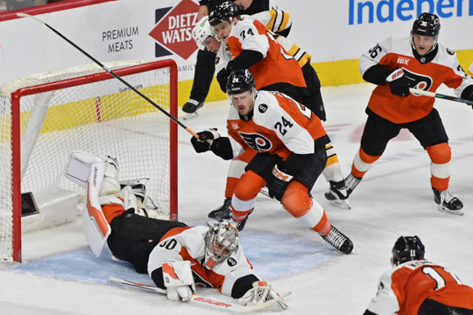 Dan Vladar #80 of the Philadelphia Flyers dives to cover the loose puck. Photo by Jack.Smart@prohockeynews.com